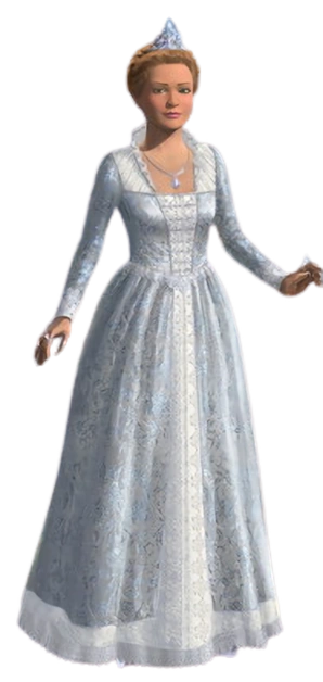 In the first film she wears a yellow ball gown in the Magic Mirror's image and is seen wearing a yellow dress similiar to Fiona's wedding gown at the swamp. In Shrek the Third she wore a long silvery blue dress with a big collar and a silver tiara, several rings and glass slippers, which she later used as weapons.