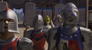 The knights surround Shrek with their weapons drawn and back him up against a giant barrel of beer. Shrek gulps down a tankard of beer and then smashes the keg with it, causing beer to shoot out. The force of the beer knocks down the knights and turns the ground into a slush of mud. Donkey climbs onto another giant barrel and uses it to roll over several of the knights. Shrek easily beats the knights with various wrestling moves and wins over the crowd's favor as well. Farquaad watches on with shock and annoyance at the ease with which Shrek bests his finest knights. After the fight, all fifteen knights are left laying unconscious in the arena, making Shrek the tournament's champion. The knights' fate after the tournament is unknown, but they've presumably entered medical care afterwards.