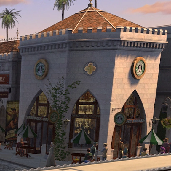 A Farbucks/Celtic shop can be seen in the left of the scene where Shrek is being taken to Rumpelstiltskin's castle while the Far Far Away villagers boo him. However, it is abandoned due to Rumpelstiltskin taking over.