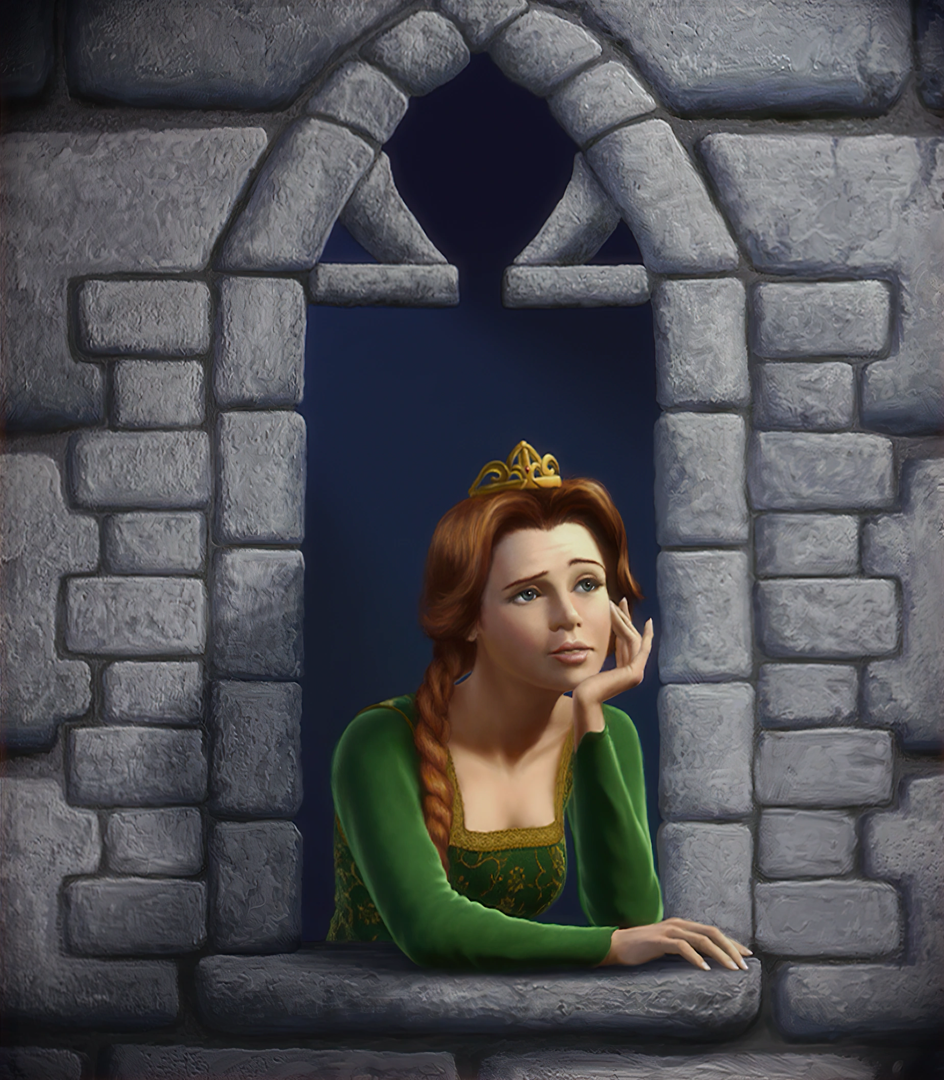 Fiona first meets Shrek when he crashes into the roof of her tower after being thrown by Dragon. Wearing pieces of armor taken from dead knights in the Dragon's Keep, Shrek is mistaken by Fiona to be her "Prince Charming". She pretends to sleep, but instead of getting her true love's kiss, Shrek shakes her awake and unceremoniously drags out of her tower. He is all but the knight-in-shining-armor that Fiona expected; he won't recite her poetry, she gives him her handkerchief as a token of her gratitude just for him to wipe his face with it, and he hasn't even slain the dragon. Shrek goes back to retrieve Donkey from Dragon, and in the ensuing chase the three of them narrowly escape from the castle. Fiona is grateful to her rescuer despite his un-knightly behavior. Wishing to see his face so she can kiss him, Fiona orders Shrek to remove his helmet.