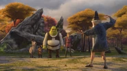 When Captain Hook and his cronies ambush Shrek, Donkey, Puss and Artie, he plays his piano, and Merlin is beside him playing along until he is pushed away. After the villains retreat, Artie convinces Merlin to use a spell to teleport them to Far Far Away. But the spell causes Donkey and Puss to switch bodies (probably because they took each other's "hands" seconds before). After Prince Charming's defeat, Merlin returns, and Puss and Donkey force him to put them back in their own bodies. The spell works, but causes their tails to switch. Merlin thinks about telling them, but decides not to, though their tails have inexplicably returned to normal later.