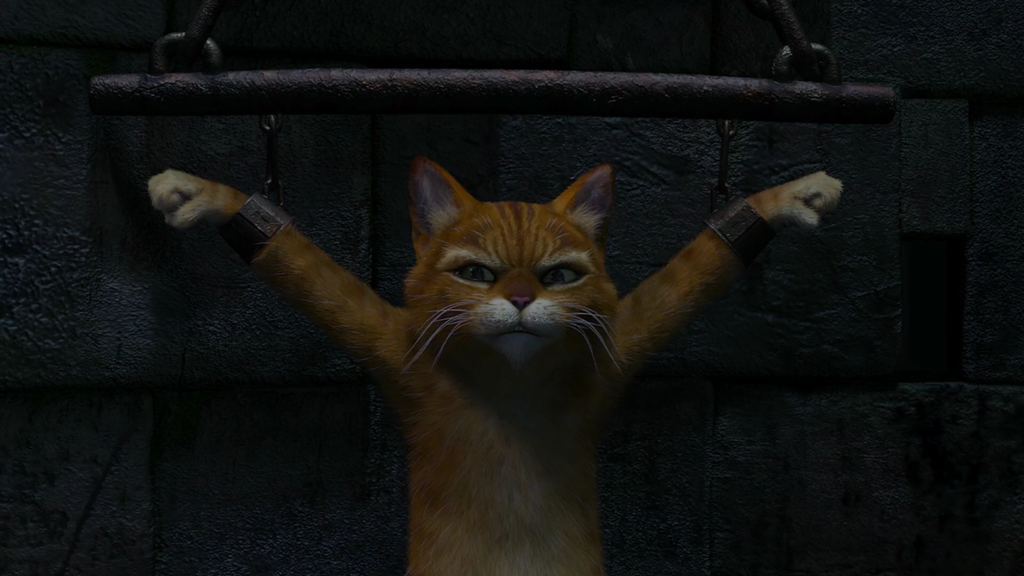 Before the events of Shrek 2, it is shown how Puss begins to run from the law, going to many terrains and getting involved with more criminal activity. Trying to clear his name, the cat is continuously unsuccessful. He gets captured by a man that wanted the reward for his capture but he luckily escapes and goes back to San Ricardo, where he hides in a bar where some men tells him that the Magic Beans are real and they take to the Golden Goose but that they're owned by the fearsome outlaws Jack and Jill. Seeing this as an opportunity to restore his name, Puss goes in Jack and Jill's house but he gets hindered by a female cat named Kitty Softpaws, also searching for the Magic Beans.